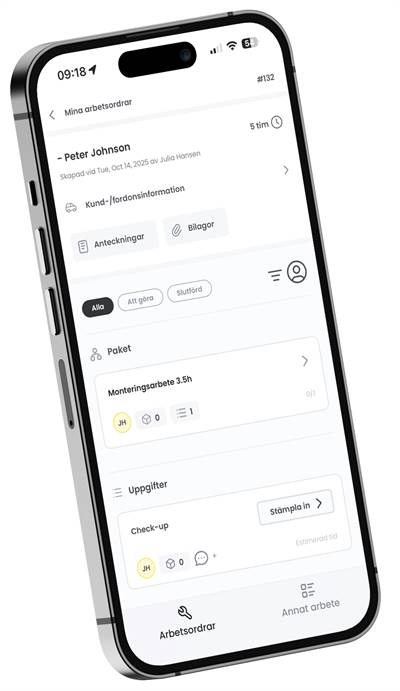 Med vår app kan mekanikerna bland annat stämpla in och ut på arbetsordrar, ladda upp bilder och filer i olika ärenden, skriva kommentarer, klarmarkera arbeten och markera artiklar som monterade.